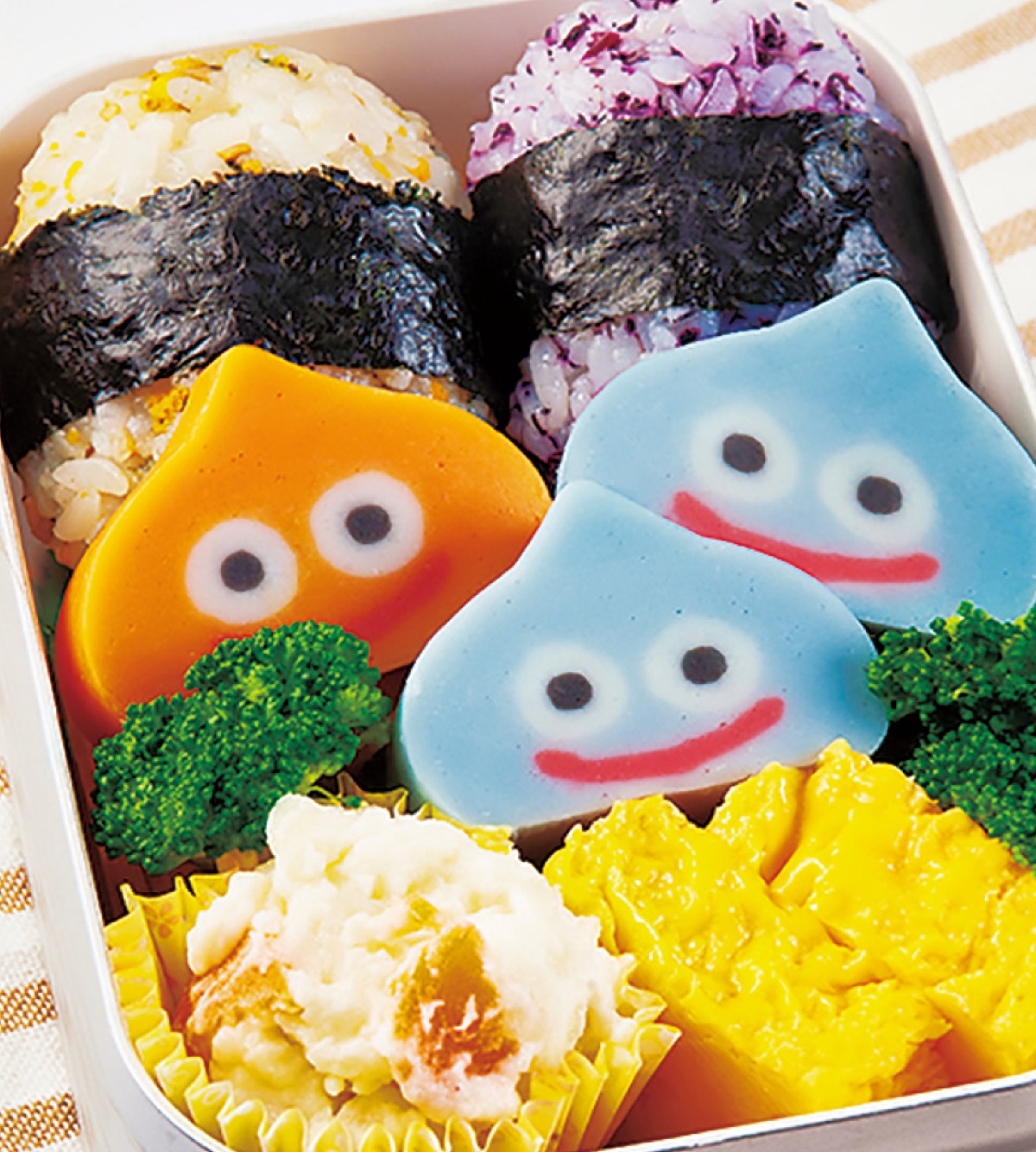 健康への配慮から添加物を使わず、水色の「スライム」の着色にはクチナシ、オレンジ色の「スライムベス」にはパプリカなど、自然の素材を使用。この担当者は「切っても切っても可愛らしいスライムが登場する。お弁当や朝食、おつまみにピッタリ」と、でき栄えに自信をのぞかせる。