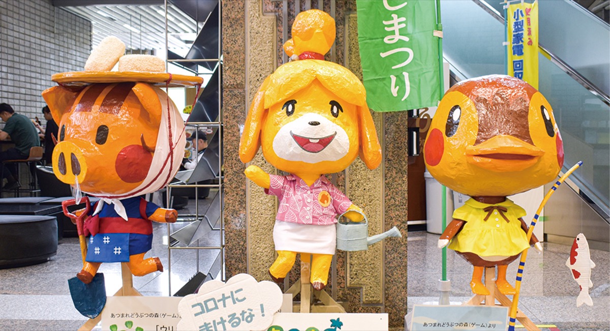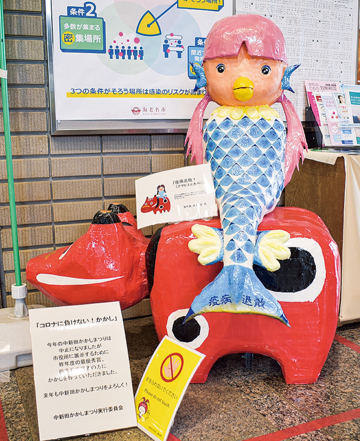 市役所駐車場側入り口そばには、ナース姿の「えび〜にゃ」かかしがお目見え。作成したのは昨年のまつりで最優秀賞を受賞した井上肇さんで、1階ホールには井上さんの新作「疫病退散!(アマビエと赤べこ)」も展示された。ホールには市教育支援教室びなるーむに通う生徒が人気ゲーム「あつまれどうぶつの森」のキャラクターを模して作成した「あつまれかかしの森」も展示され、来庁者を出迎えている。
