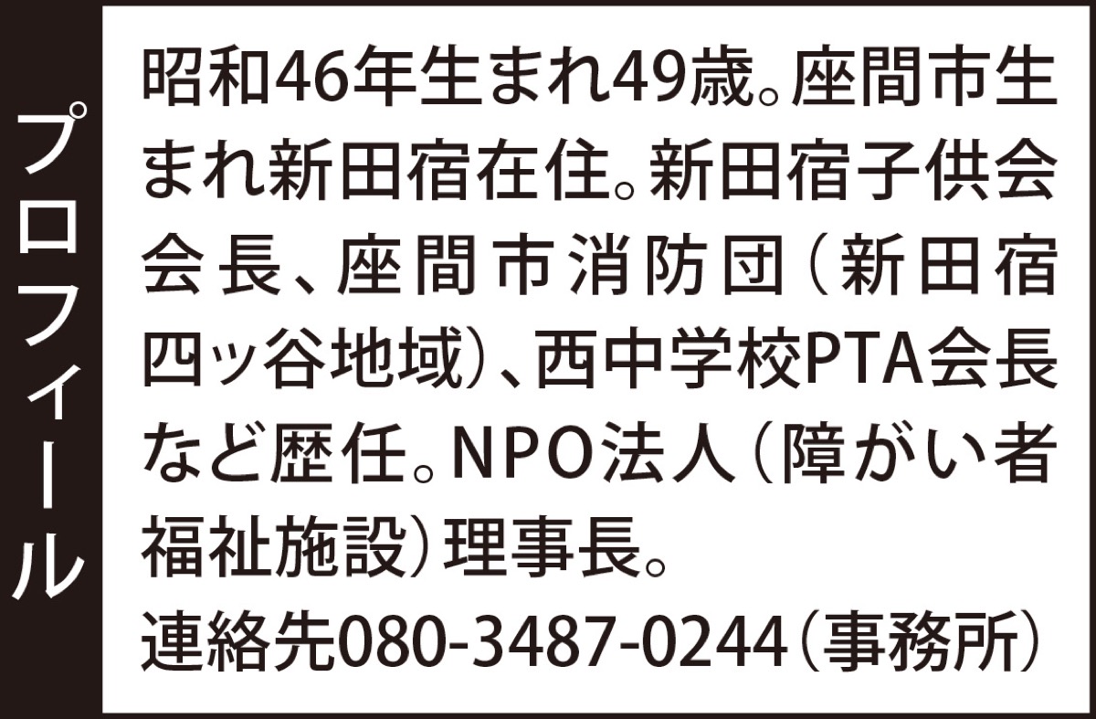 皆さんも記憶に残っていると思いますが、昨年の豪雨。今までにない災害の危険を感じたのではないでしょうか。今までおこなわれてきた「安心・安全」の想定を超えた事態が発生しております。気象変動による豪雨や猛暑、新型コロナウィルスの感染拡大など、私たちが一緒に考え力を合わせて、災害に強い地域を作り「安心・安全に暮らせる座間」を目指す時代がきました。子供たちと一緒に過ごした子供会会長、生徒たちと過ごした中学校のPTA会長、そして障がい者福祉施設での支援員として経験したことを大切にし、世代や立場を超えたコミュニティーによる共生社会の実現に力を注ぎ明るい未来のある座間を実現できるよう前に進んでいく考えであります。