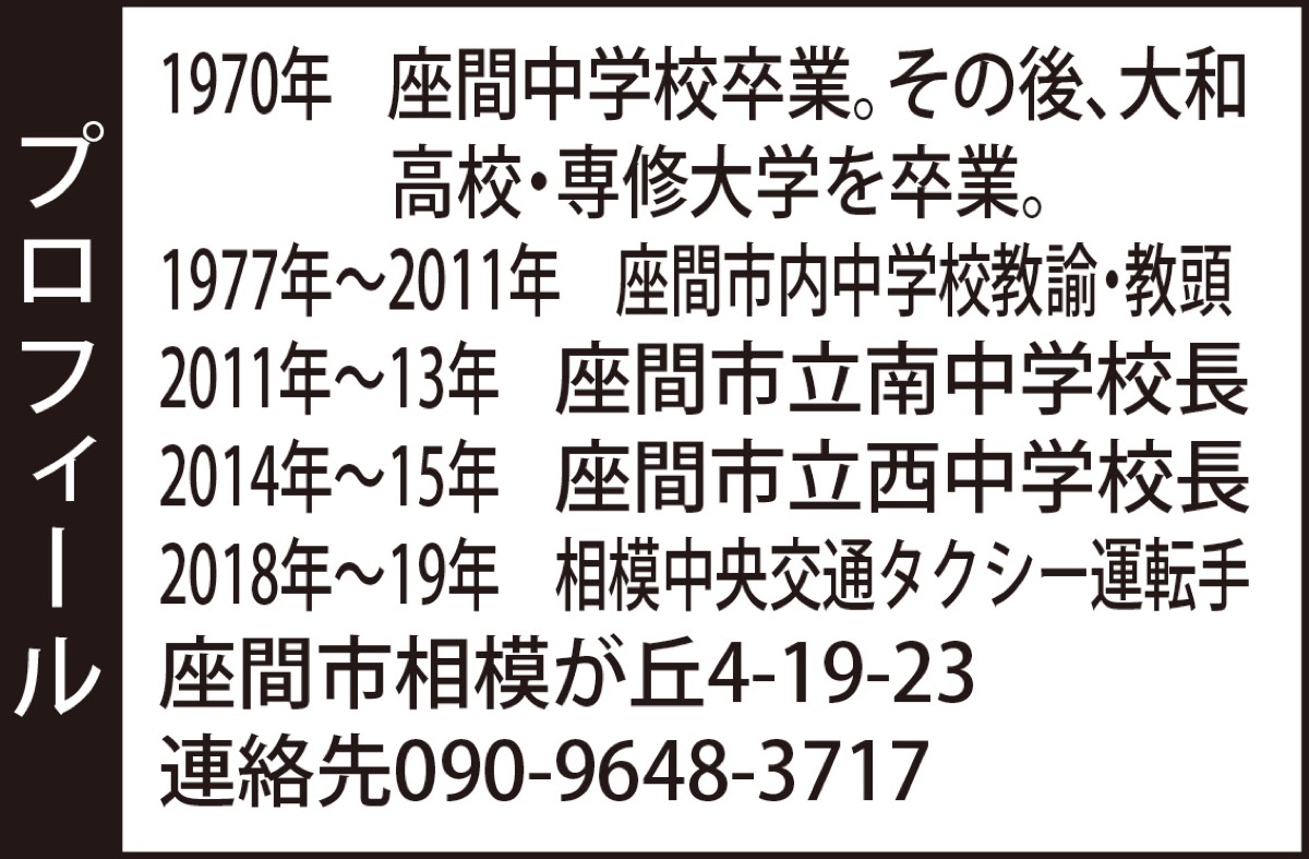 座間市の公立中学校の社会科教員、そして教頭・校長として38年間教育に携わってきました。