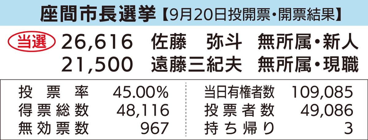 任期満了に伴う座間市長選挙は9月20日に実施され、新人の佐藤弥斗氏(50)が現職の遠藤三紀夫氏(62)の4選を阻み初当選を果たした。座間市の女性市長は史上初。佐藤氏は草の根運動で支持を広げ、現職の組織戦を圧倒した