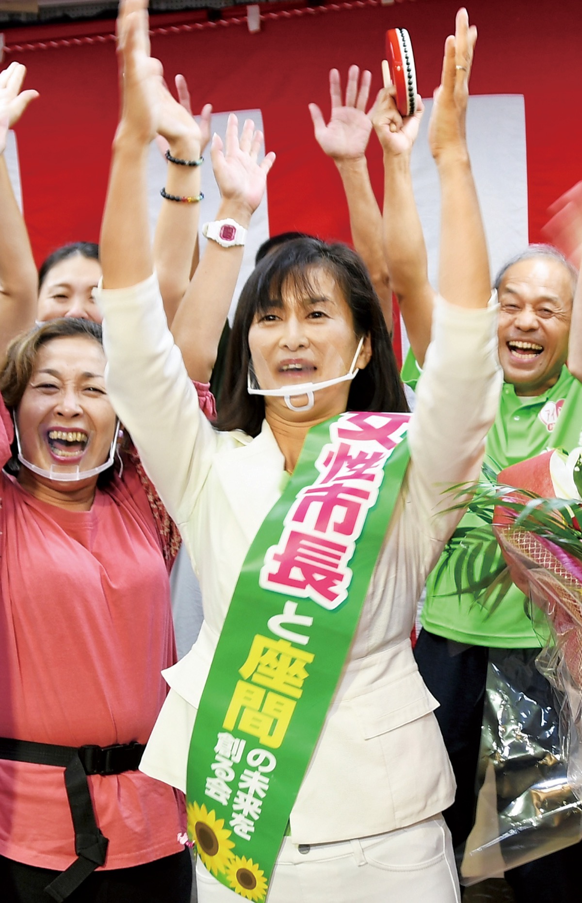 佐藤氏は「厳しい戦いだった。行政だけでなく市民の皆さんと共に課題を解決する市政を行いたい。皆さんと共に新しい未来をつくりたい」と述べ、支持者や家族と喜びを分かち合った。