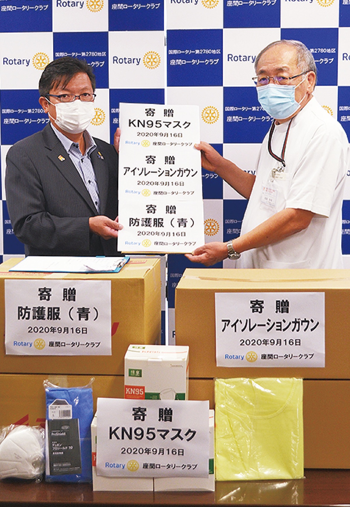 座間ロータリークラブ(溝渕信一会長)は9月16日、湘陽かしわ台病院(高原和享理事長)に新型コロナ感染症対策の医療物資を寄贈した。