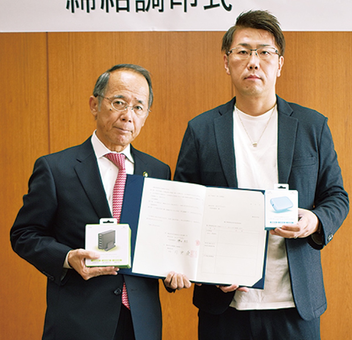 海老名市とデジタルアクセサリー製造販売の(株)MOTTERU(同市中新田、櫻田良太代表取締役)が10月29日、災害時にモバイルバッテリーなどの電子機器類を供給する協定を締結した。海老名市と民間事業者などによる災害協定は99件目。