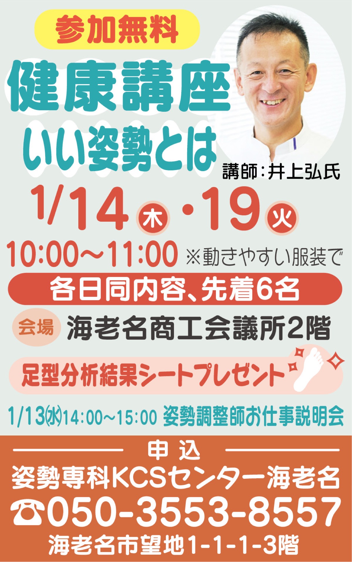 しつこい肩こりや腰痛、実は姿勢の悪さが原因かも。正しい姿勢を学べる無料健康講座が1月14日と19日に海老名商工会議所で開催される。