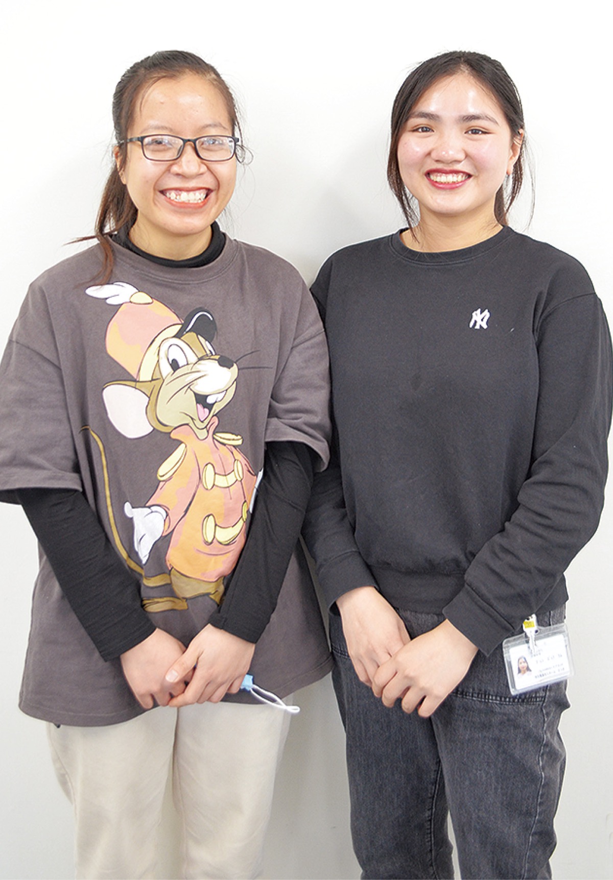 コロナ禍で消毒、検温など業務負担が増える中での就労開始。ヒエンさんは「不安はあったが周りの人が優しく教えてくれるので安心」と流ちょうな日本語で答える。両親と毎日電話をしているというタムさんは「両親は心配しているが、ヒエンさんが一緒なので心強い」と笑顔を見せた。