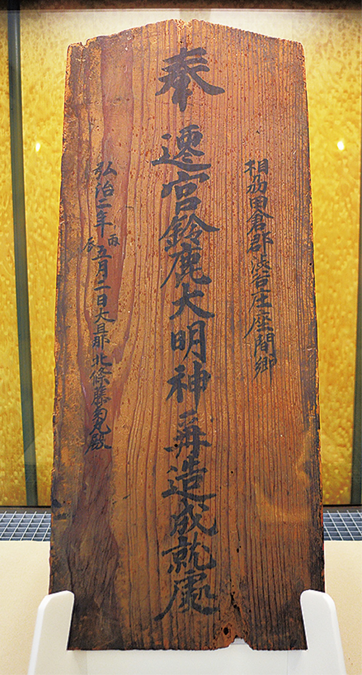 棟札とは、神社仏閣などの棟上げを記念して、寄進者や造営日などを記録した木製の札。文化財に指定された棟札は高さ586mm、幅234・5mm、厚さ18・4mmで、焼失した社殿を再建した1556(弘治2)年に北条藤菊丸が寄進した記録。過去の大火で同年以前の所蔵品が現存しないため同社で最古の所蔵品となる。