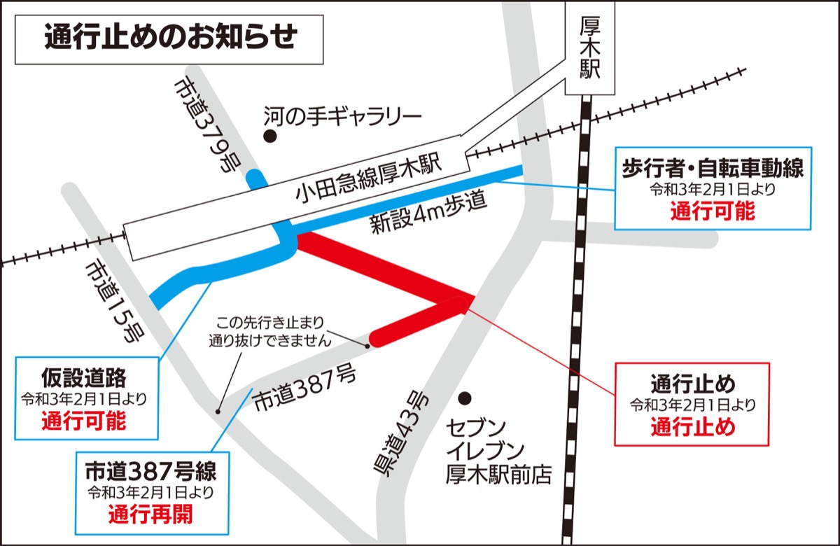 厚木駅南側の再開発を行っている「厚木駅南地区市街地再開発組合」は、2月1日(月)から市道379、387号線の一部を市道を通行止めにする。通行止めになった道路は廃道になることが決定している。工事中は市道379、389号線は県道43号線からの通行は出来ず、市道15号線から迂回することになる。