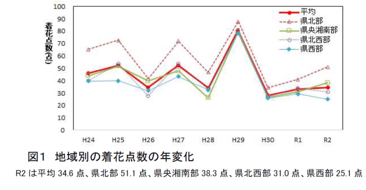 この点数の平均値は34・6点で昨年の33・2点をわずかに上回ったが、過去9年間の平均44・0点を下回り、調査開始から4番目に低い値となった。各地の着花点数は県北部51・1点、県央・湘南部38・3点、県北西部31・0点、県西部25・1点だった。
