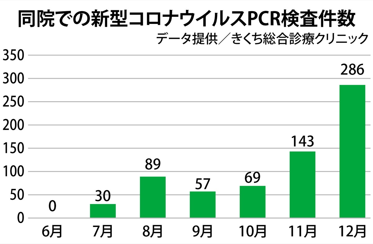 綾瀬市のきくち総合診療クリニックでは昨年6月から、誰でも検査が受けられる体制を整備。症状があれば公費だが、症状がなくても自費で検査が受けられる。PCR検査数は10月は69件、11月143件、12月は286件と右肩上がりに増え、1月も1日平均30件と12月を上回るペースで推移してきた。