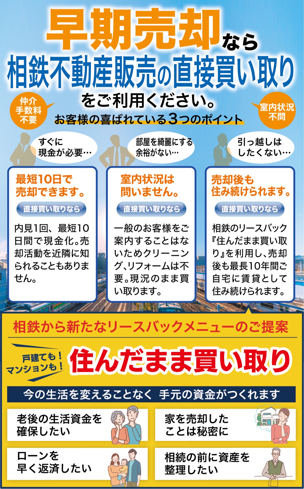 大切な資産を誠実に評価してくれると評判の相鉄不動産販売(株)では、マンションや土地、戸建などの買取りに力をいれているという。同社は自社で直接買い取りもできるため、仲介手数料は不要で、しかもスピーディーかつ確実に現金化をしてくれるので安心だ。また、部屋を綺麗にする余裕がない人でも、家の故障や不具合の修繕などは不要で、現状のままで売却できる。引き渡し時期を最大限考慮してくれるのも嬉しい。
