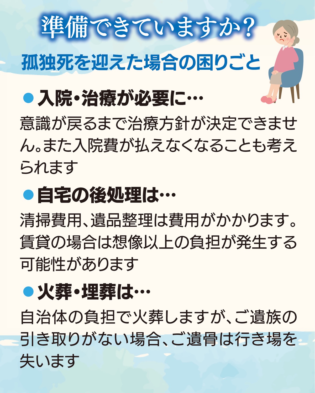 社会福祉法人足跡の会は座間市と協働して、「無縁遺骨」を「縁のある遺骨」に変え、誰もが適切に埋葬できるよう取り組みを進めている。同法人の木村さんは「生前に準備をしていれば、無縁遺骨にならずにすみます。立派な墓地や永代供養は必要ないといっても、費用は必ず発生することを知らない方も多いようです。親族や友人に迷惑をかけないために、ご遺骨のことについてもしっかりと考えておく必要があります」と話す。