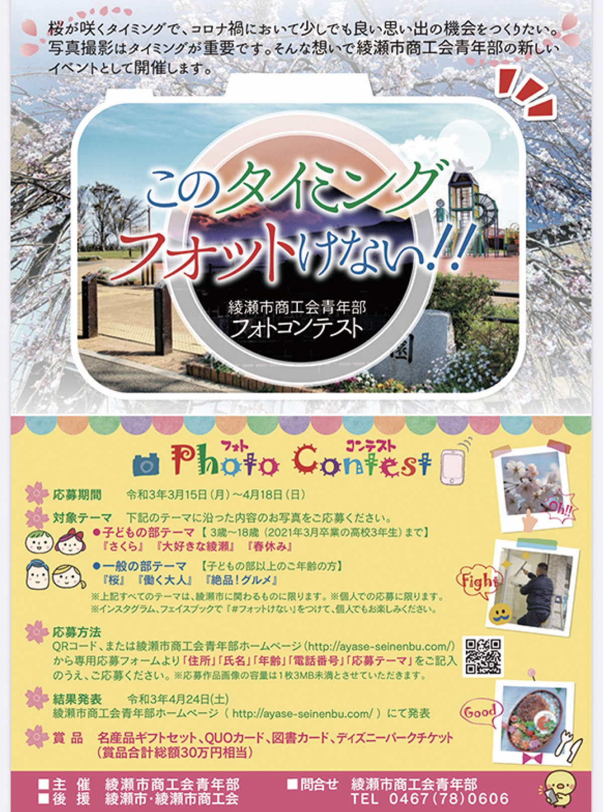 綾瀬市商工会青年部(柏木秀一部長)がフォトコンテスト「このタイミング、フォットけない‼」への応募を呼び掛けている。フォトコンテストは青年部が主催する「桜まつり」の代替えとして初めて企画された。