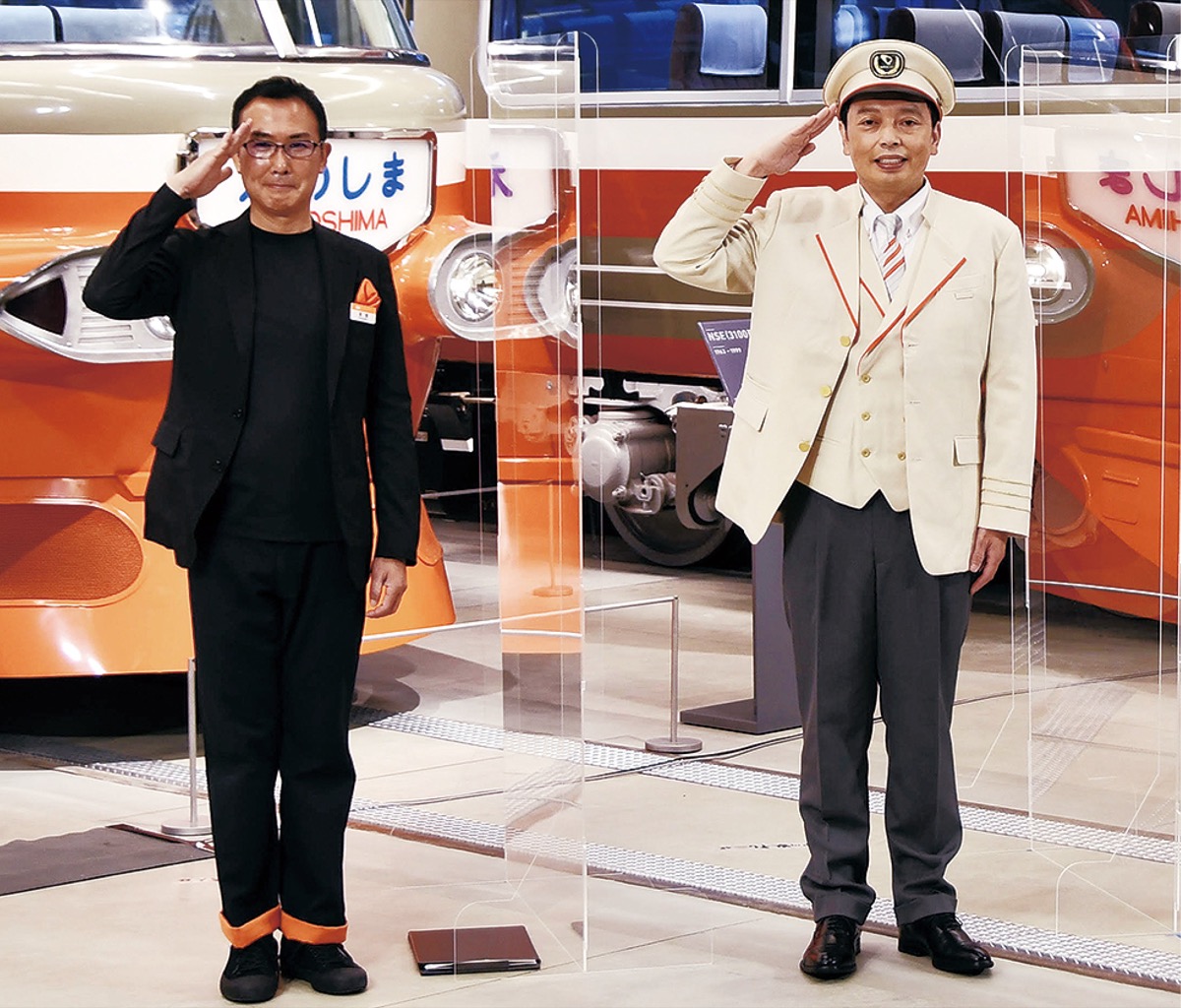 小田急電鉄の「ロマンスカーミュージアム」が19日、海老名駅隣接地にオープンした。事前に行われた「出発式」には漫才コンビ「中川家」の礼二さんらがゲストとして登場。約150人の関係者らを前に「出発進行!」と声を上げ高橋孝夫館長(写真左)と開館を宣言した。