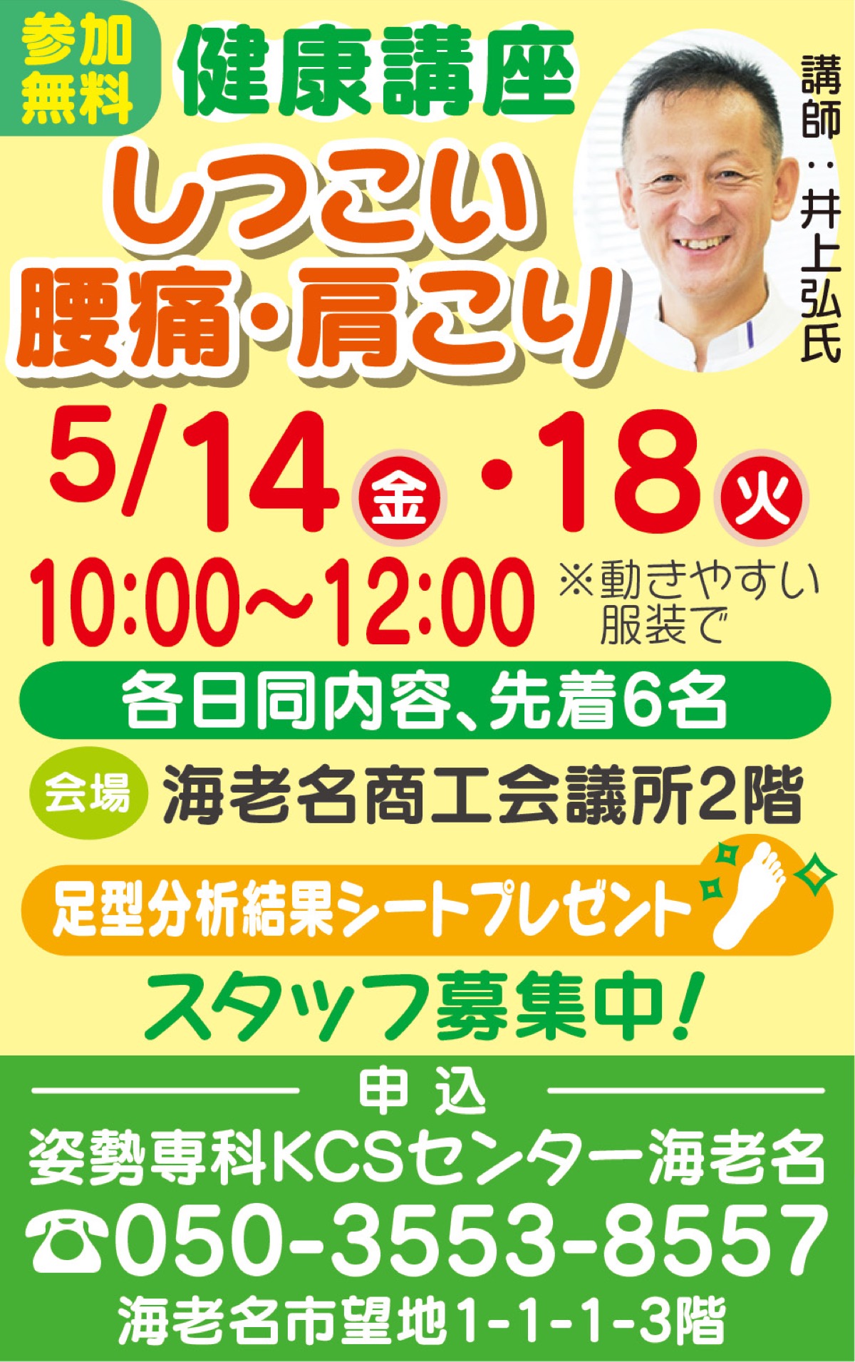 「どこに通っても治らない腰痛や肩こり、諦めないで」。日々苦しい痛みの原因を体の仕組みから学ぶ無料講座が5月14日と18日に海老名商工会議所で開催される。