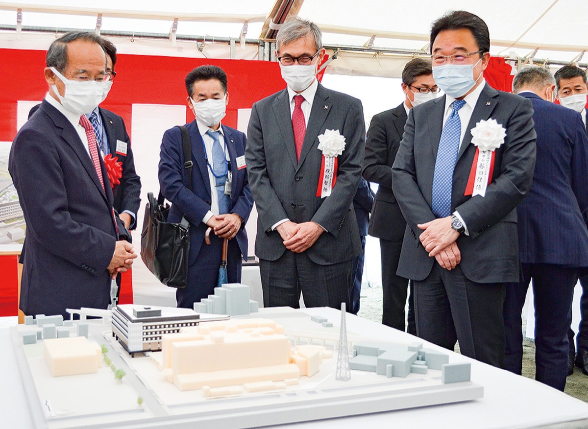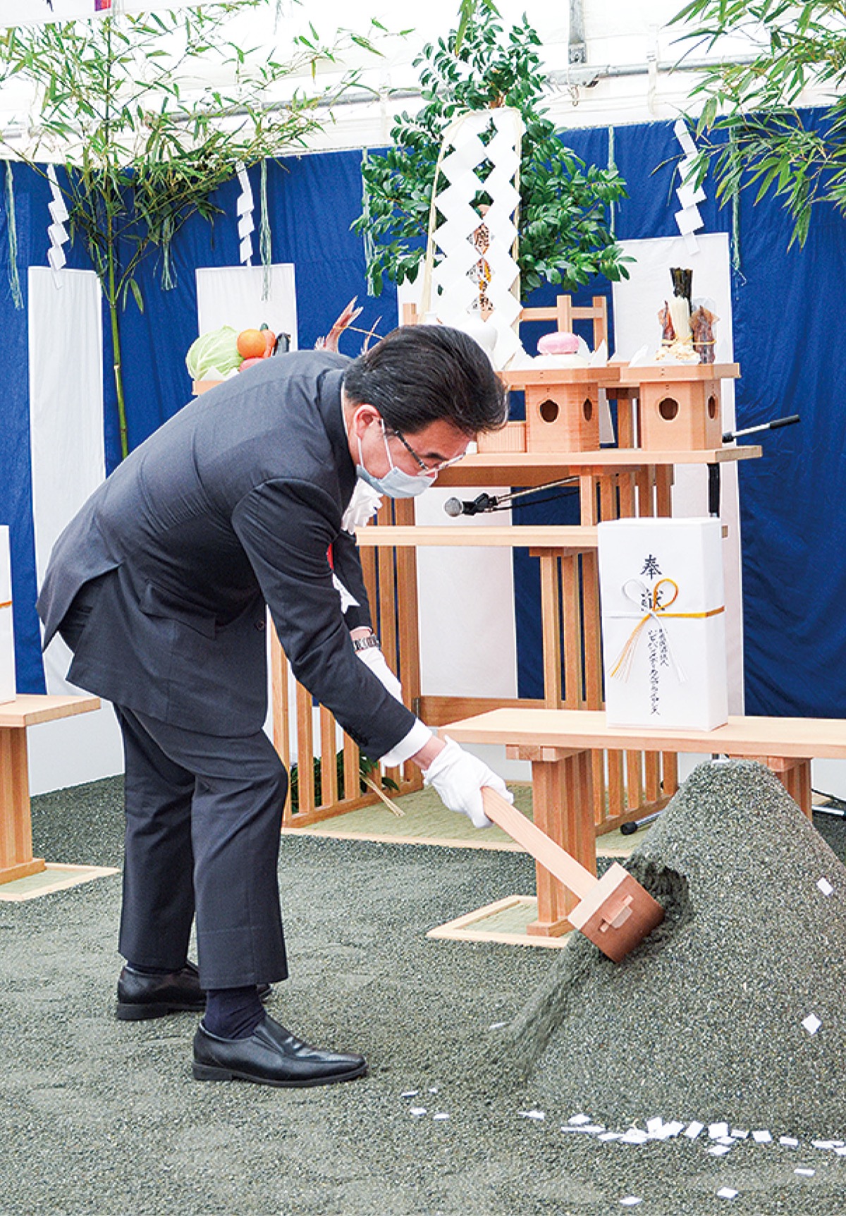 式典では鍬入れなどの神事で工事の安全を祈願。谷口理事長は「計画は10年前から動き出していた。この日を迎え安堵と同時に奮い立つ思い。完成が待ち遠しい」とあいさつした。