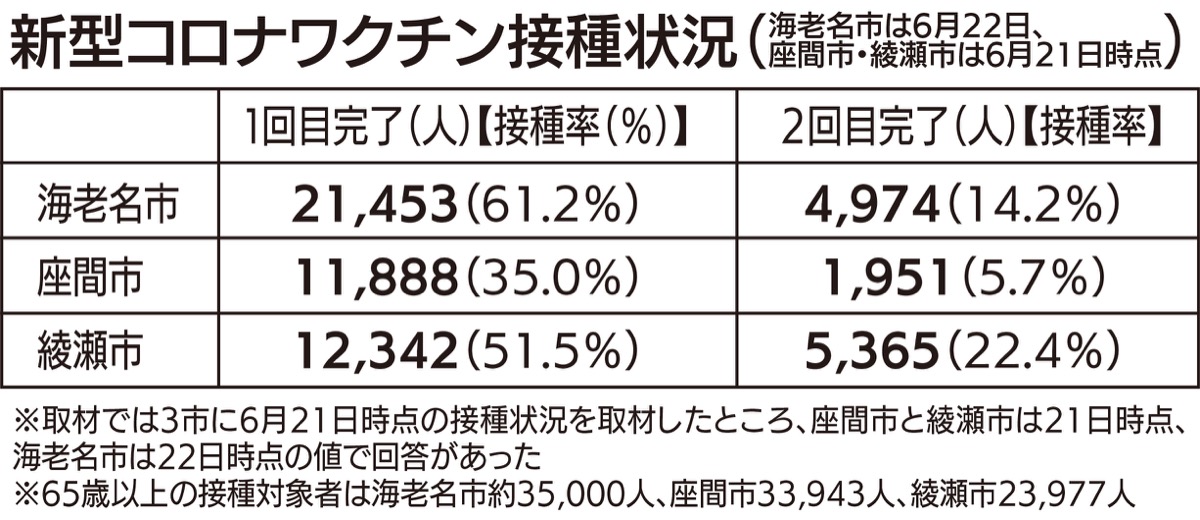 海老名市では5月26日から北部公園体育館、ビナレッジ、海老名運動公園体育館で集団接種が始まり、17の医療機関で個別接種を行っている。6月22日時点で高齢者優先接種対象者の61・2%、2万1453人が1回目の接種を終えた。そのうち、1回目の3週間後を目安に行う2回目の接種を終えた人は対象者全体の14・2%、4974人だった。接種希望者は高齢者全体の8割、約2万8千人を見込む。