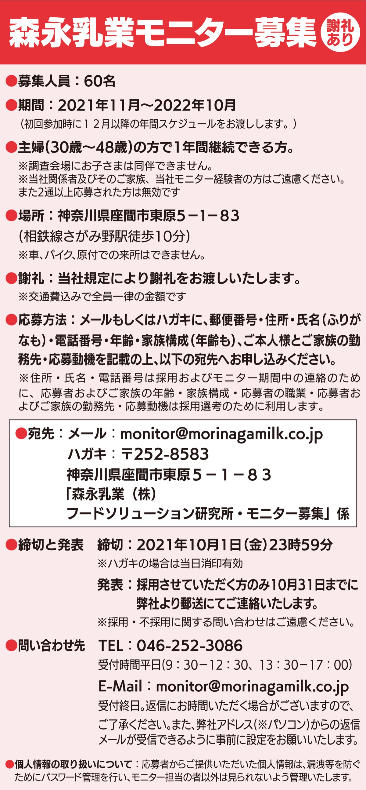 森永乳業株式会社では、お客様の声を積極的に商品開発に活かすためにモニターを募集している。原則月一回、座間市の研究センターに訪問して牛乳・乳製品を中心とした商品の風味や使い勝手などのアンケート調査に一年間参加するもので、謝礼もある。