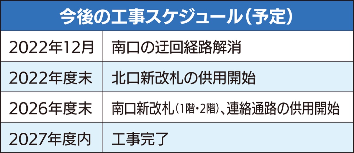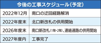 20年9月から小田急線やJR相模線などへの乗り換えで利用されている迂回(うかい)経路については、22年12月に解消される。南口新改札(1階・2階)や連絡通路の供用開始は26年度末を予定している。全ての工事が完了するのは27年度内。