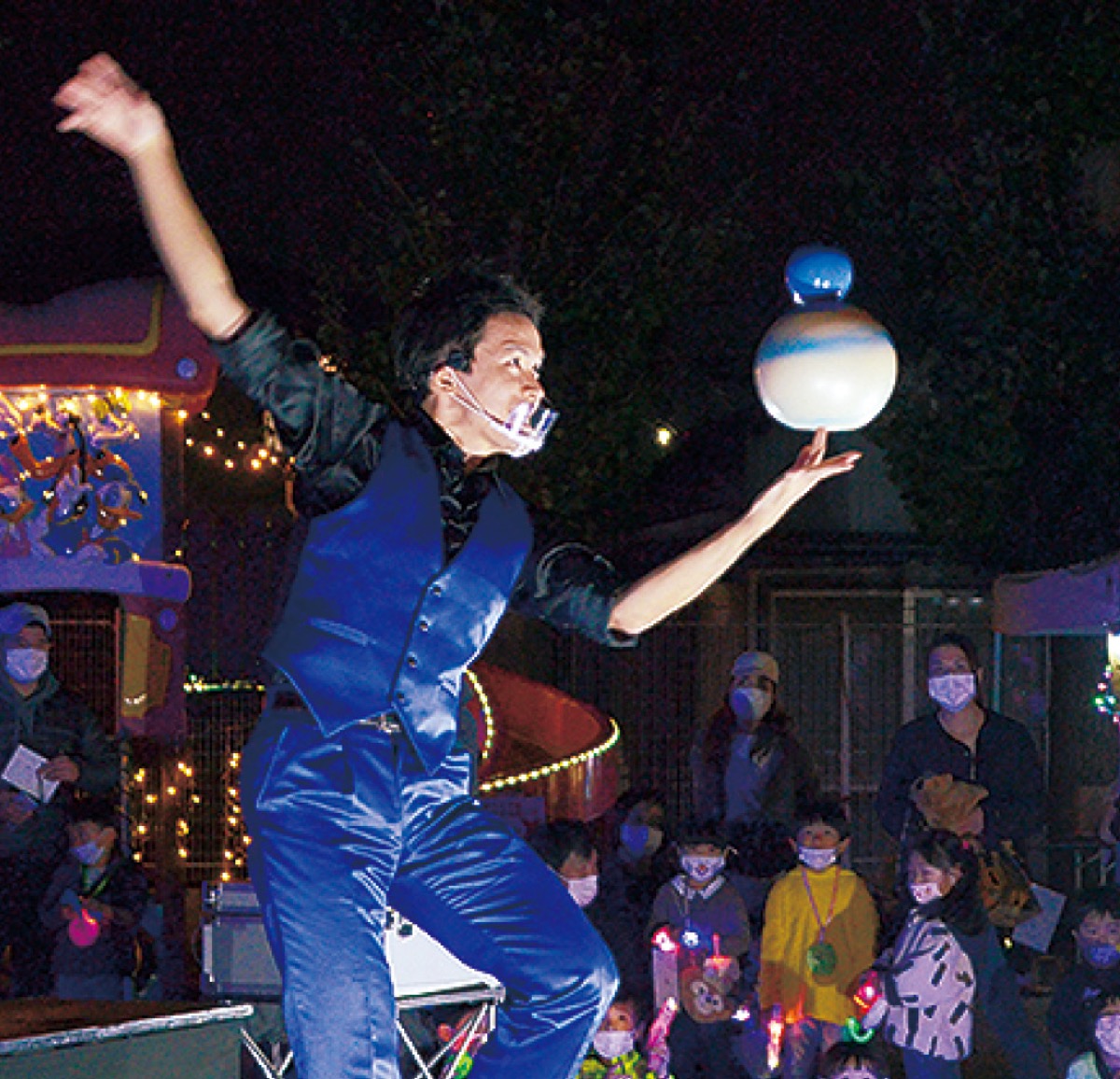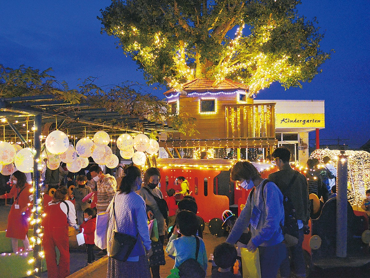 保護者と教職員が協力して1万球を超える電球でイルミネーションを施した園内には、ボール投げやボウリング、お菓子釣りなどの特設屋台もずらりと並び、子どもたちは光るおもちゃを身につけながら薄暮の時間を楽しんでいた。