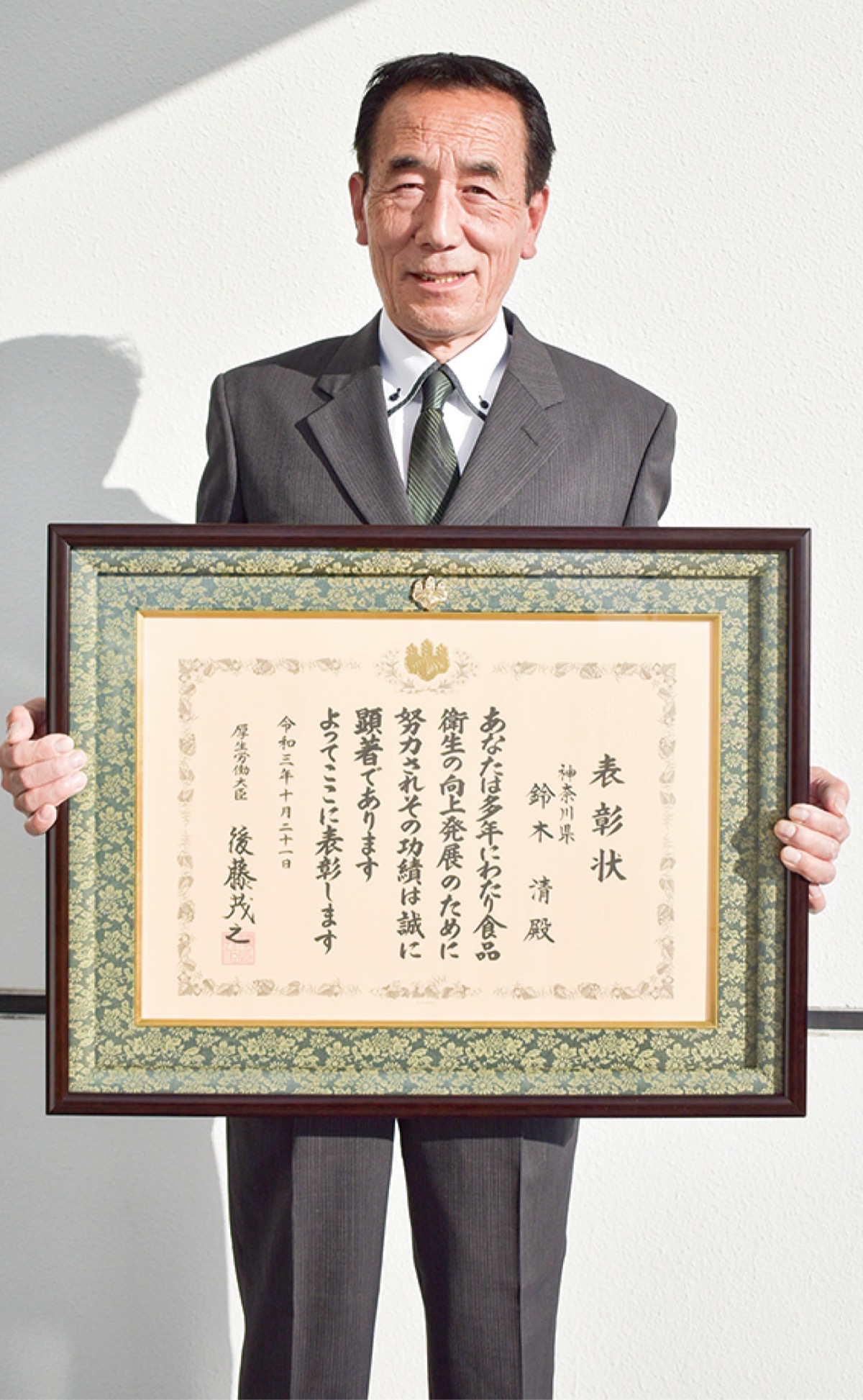 海老名市食品衛生協会の会長を務めている鈴木清さん(株式会社シンエン社長)が、このほど食品衛生事業者功労厚生労働大臣表彰を受賞した。