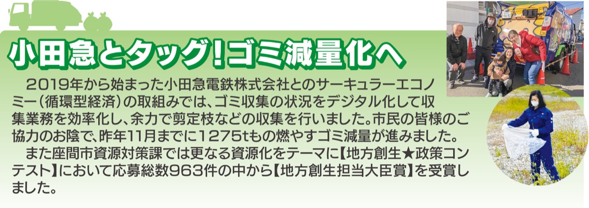 2019年から始まった小田急電鉄株式会社とのサーキュラーエコノミー(循環型経済)の取組みでは、ゴミ収集の状況をデジタル化して収集業務を効率化し、余力で剪定枝などの収集を行いました。市民の皆様のご協力のお陰で、昨年11月までに1275tもの燃やすゴミ減量が進みました。 また座間市資源対策課では更なる資源化をテーマに【地方創生★政策コンテスト】において応募総数963件の中から【地方創生担当大臣賞】を受賞しました。