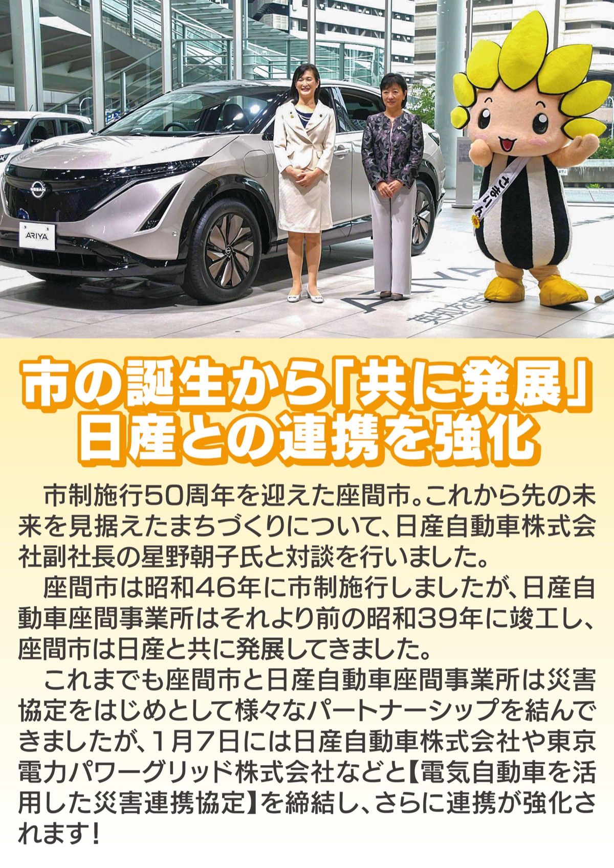 市制施行50周年を迎えた座間市。これから先の未来を見据えたまちづくりについて、日産自動車株式会社副社長の星野朝子氏と対談を行いました。座間市は昭和46年に市制施行しましたが、日産自動車座間事業所はそれより前の昭和39年に竣工し、座間市は日産と共に発展してきました。これまでも座間市と日産自動車座間事業所は災害協定をはじめとして様々なパートナーシップを結んできましたが、1月7日には日産自動車株式会社や東京電力パワーグリッド株式会社などと【電気自動車を活用した災害連携協定】を締結し、さらに連携が強化されます!