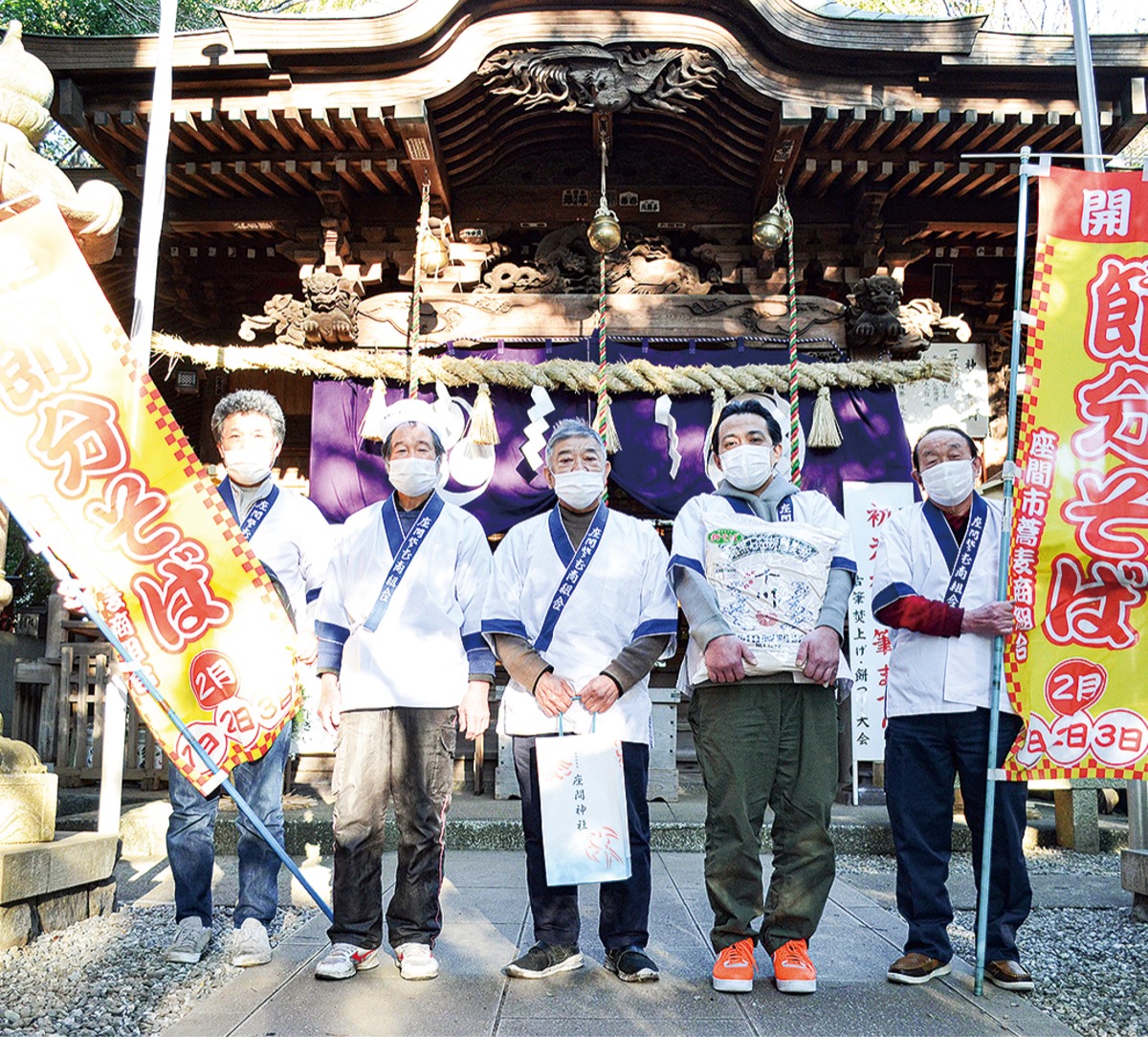 座間市内13店舗のそば店が加盟する座間市蕎麦商組合(瀬川清光組合長)は1月14日、座間神社でそば粉の祈祷を行い開運の願いを込めた。祈祷したそば粉は各店に配分され、10年前から組合が企画している「七福節分そば」に使用される。