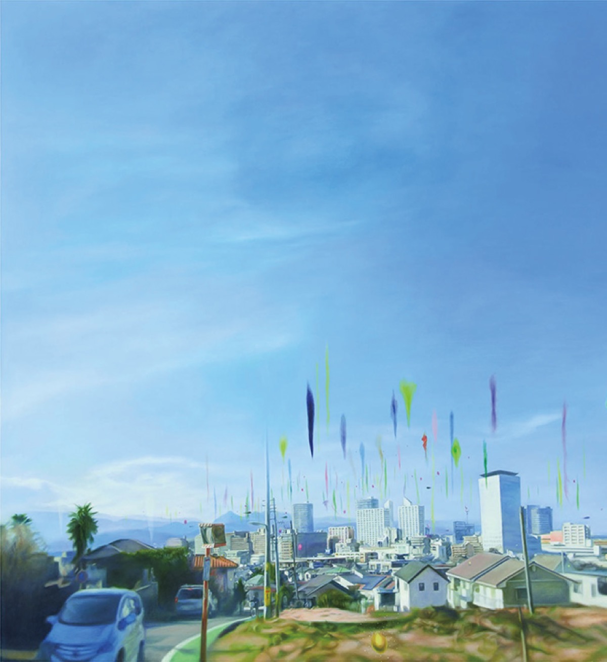 城戸さんは海老名の中心街と空が見渡せる風景と、そこから得られた感覚を描き入選。昨年12月の美術展で展示され、来場者2795人が投票で選ぶオーディエンス賞を受賞した。