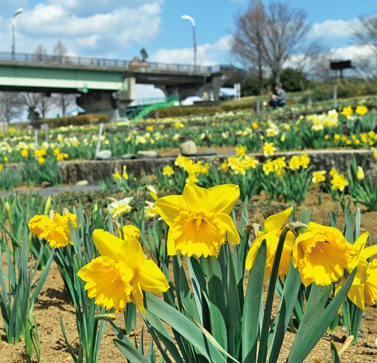 座間市と厚木市をつなぐ座架依橋の河川敷「水と緑の風広場」で3月20日(日)から24日(木)まで、さまざまな種類の水仙が咲く「相模川水仙まつり」が開催される。今回で開催は最後となり、25日(金)からは球根の掘り出し会も行われる。