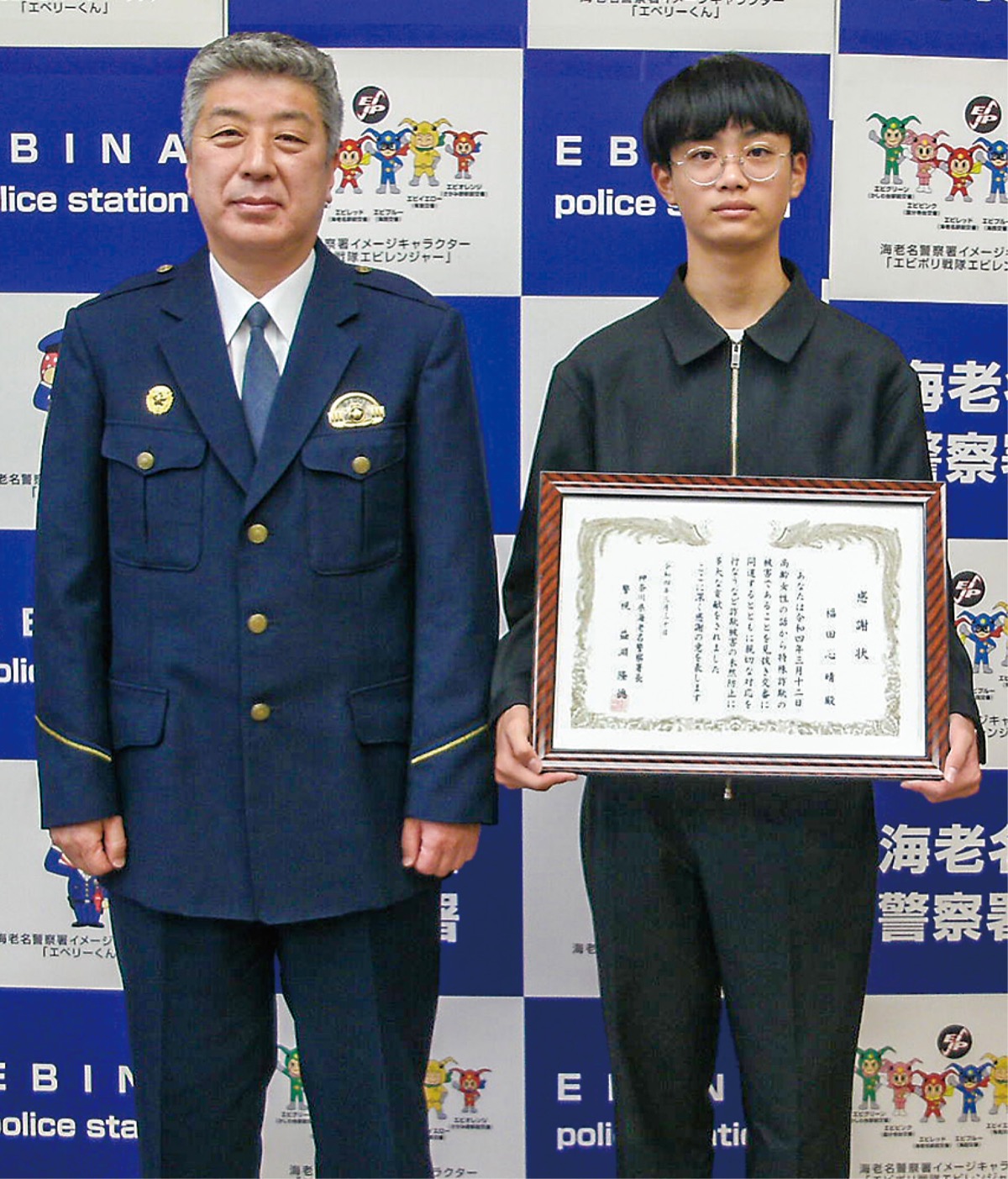 海老名警察署(益淵隆徳署長)は3月30日、特殊詐欺の被害を未然に防止したとして海西中学校3年生の福田心晴さんに感謝状を贈った。