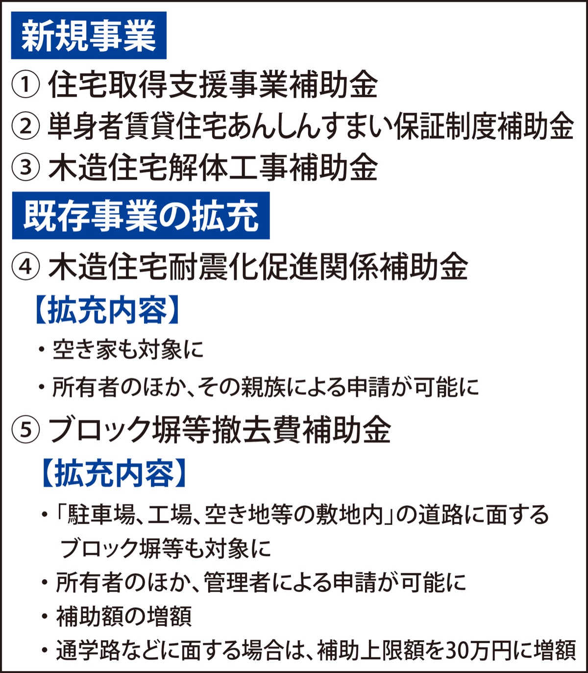 【2】は単身世帯の安否確認や死亡に伴う原状回復費用への対応。【3】は1981年5月以前の旧耐震基準で建築された木造住宅の解体費用を30万円補助し、非課税世帯の空き家には最大50万円まで補助する。当初予算で4件200万円を確保した。