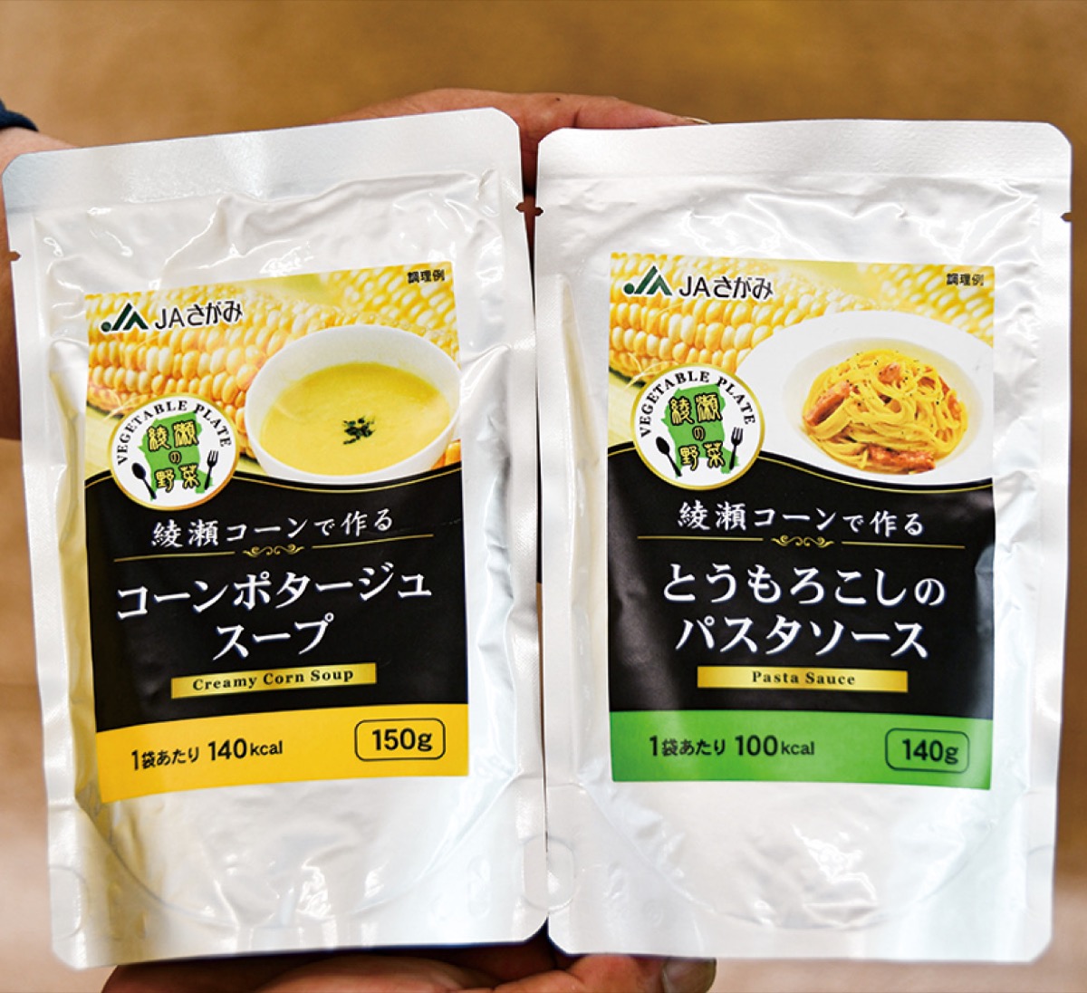 綾瀬市が認定する綾瀬ブランド「菜速あやせコーン」を使った「コーンポタージュスープ」と「とうもろこしのパスタソース」がこのほど完成し、5月10日からJAさがみグリーンセンター綾瀬(同市深谷中)の店頭に並んでいる。