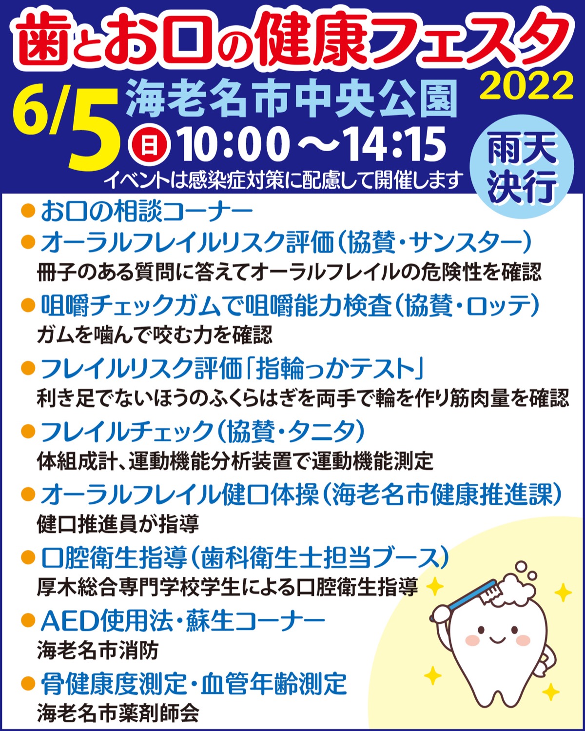 6月4日から10日の「歯と口の健康週間」に合わせ、一般社団法人海老名市歯科医師会(鈴木彰会長)が6月5日(日)に「歯とお口の健康フェスタ2022」を開催する。海老名市中央公園で午前10時から午後2時15分まで。今年のテーマは「いただきます 人生100年 歯と共に」。