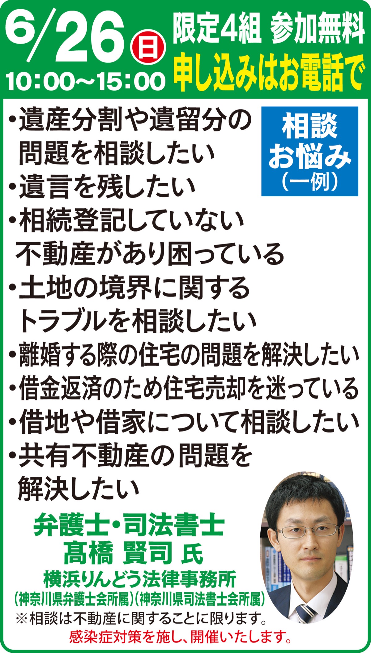 相鉄不動産販売・海老名店では、弁護士による相続・不動産の無料個別相談会を6月26日(日)に行う。相談を受けるのは弁護士・司法書士の高橋賢司氏。相続や債務整理、離婚時の財産分与などを中心に、不動産に関する多くの相談を受けており「今まで悩んでいた問題が解決できた」など参加者から好評だ。