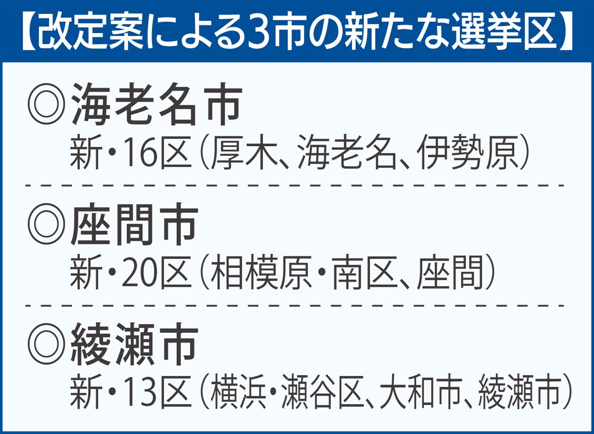 勧告によると神奈川は現行の18選挙区のうち11選挙区が改定の対象となり、全20選挙区となる。現在は13区(大和市、海老名市、座間市の一部、綾瀬市)の海老名市は新たな16区、市域が13区と16区に分かれている座間市は全域が相模原市南区との新たな20区になる。