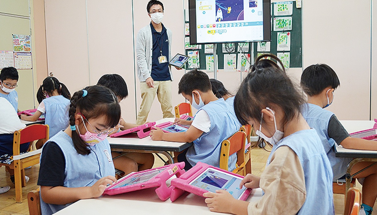 教室では一人一台タブレット端末が貸与され、園児たちは画面上の動物キャラクターの動作の進む方向や距離、速さなどを簡単な計算をしながら決めていた。同園の担任は「子どもたちはワクワクしながら取り組んでいる。知識の吸収がとても早い」と話した。