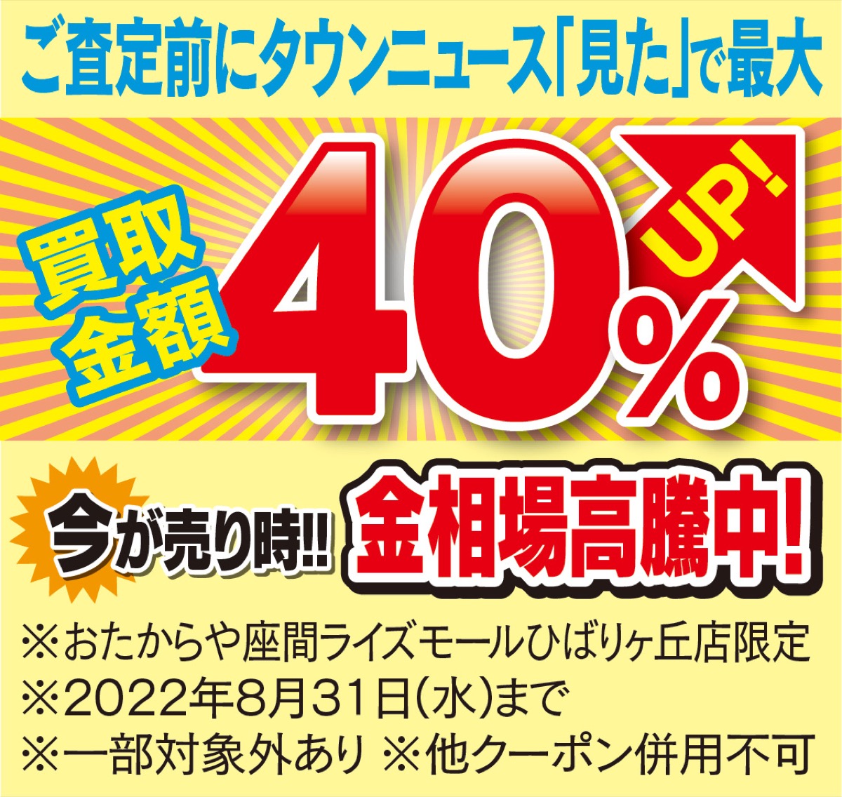 ライズモール座間ひばりが丘2階の「おたからや」では、査定前に「タウンニュース見た」で査定40%アップを実施中。2点以上の買取で1万円もプレゼントしている。