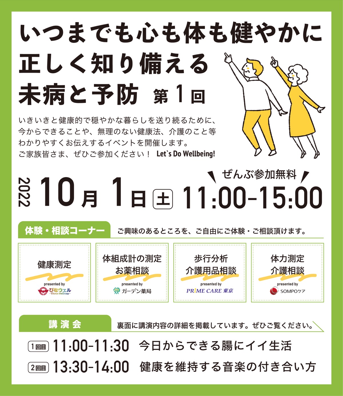 医療機関と福祉、行政サービスの拠点がフロア全体に展開する海老名駅近くの「ビナクリニクス」で、10月1日(土)に「未病」「介護予防」「重症化予防」をテーマにする初めてのイベントが開催される。今年4月に開業した「ビナガーデンズパーチ」6階フロアが会場。参加費無料。申し込み不要。誰でも自由に参加できる。