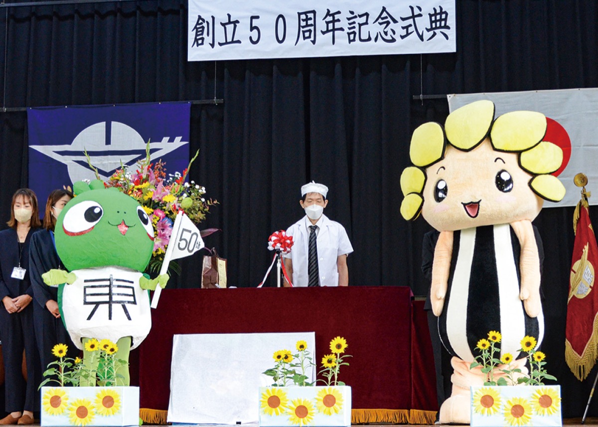 式典は「50回目のバトンをつなぎ 未来へはばたく東っこ」のスローガンで実施。1部はセレモニーで、佐藤弥斗市長ら多くの来賓が祝福に駆けつけた。あいさつに立った大谷校長は「時と人が変わっても素晴らしい伝統は多くの人に支えられて発展していく」と思いを語った。また前校長の有山周一さんは、同校の池で飼育されている亀をモチーフに考案したイメージキャラクター「かめっち」を披露した。