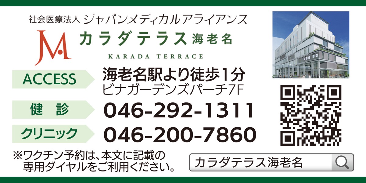カラダテラス海老名では、インフルエンザと新型コロナウイルスのワクチン接種にも予約対応している。インフルエンザワクチンは一般3300円で、65歳以上の海老名市民は公費負担により無料、海老名市民の中学生にも市独自の制度があり1000円で接種できる。ほかにも綾瀬市民や厚木市民への公費負担にも対応している。接種日は平日で予約制。