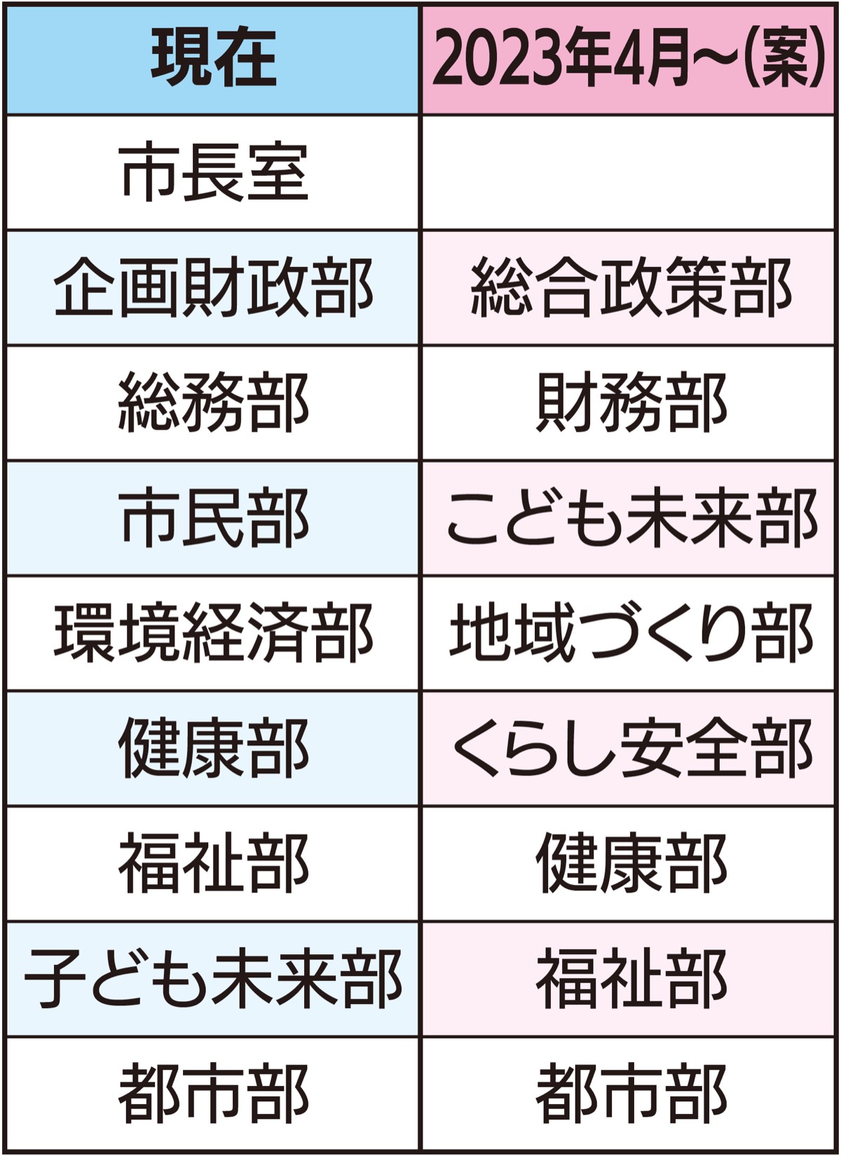 経済産業分野は、従来は環境分野と同じ部だったが、新たに「地域づくり部」に集約し、シティープロモーションや市民協働と歩調を合わせ相乗効果を図る。環境分野は「ゼロカーボン推進課」と「リユース推進課」を新設し、災害対策や環境対策を担う「くらし安全部」とする。