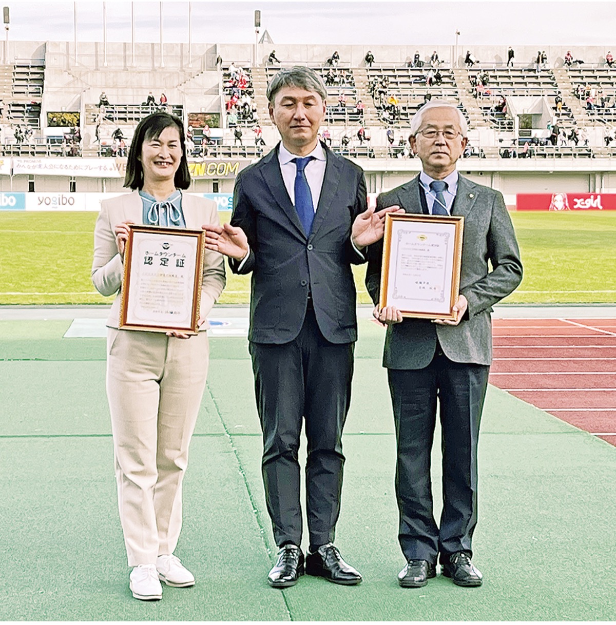 この日、相模原市内の競技場で行われた同チームの本拠地公式戦前に古塩政由市長と佐藤弥斗市長が足を運び、チームの馬場正臣社長に認定証を手渡し、試合前の選手を激励した。