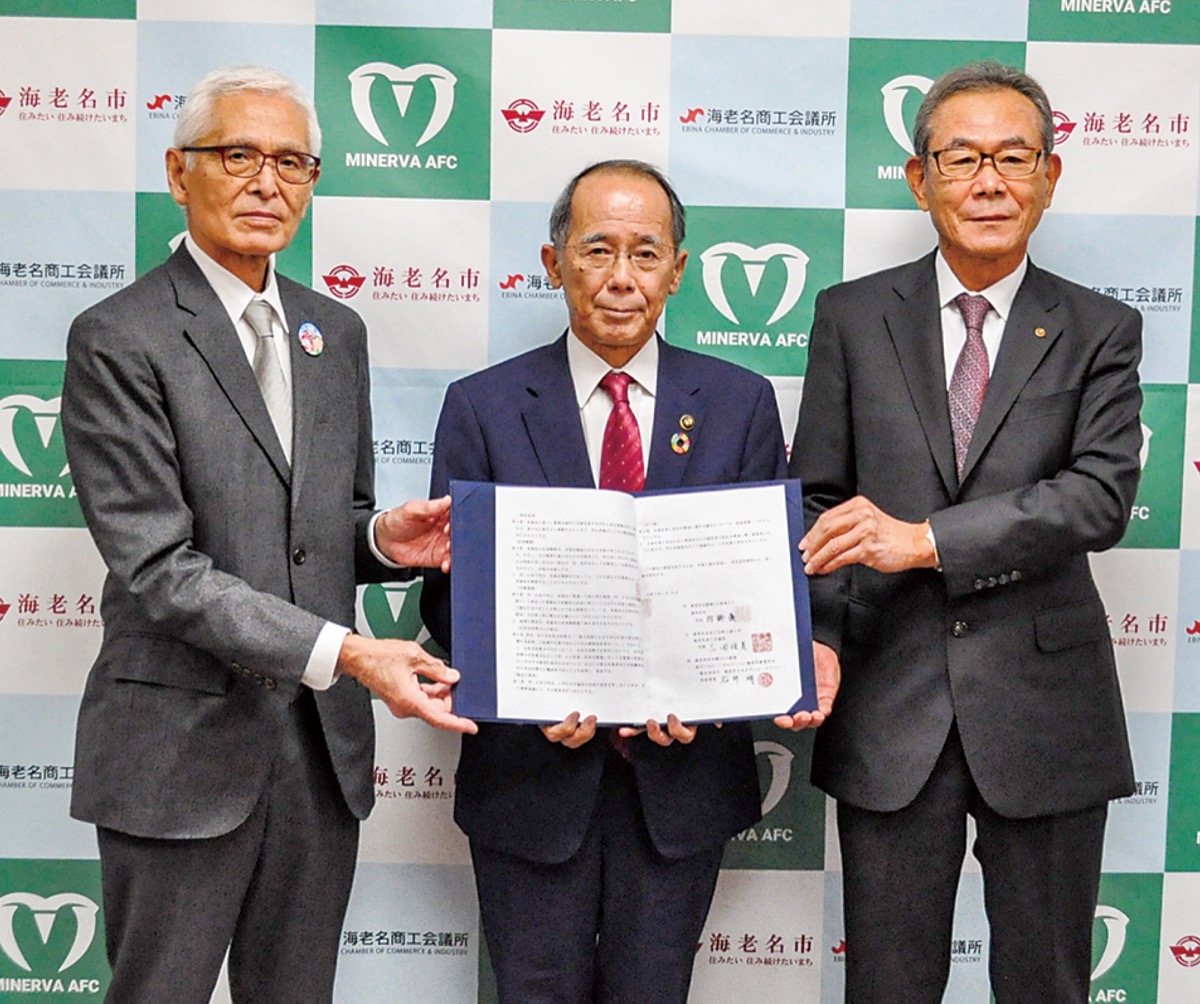 市役所で行われた調印式には、内野優市長と三田佳美海老名商工会議所会頭、石井明(一社)海老名ミネルヴァAFC代表理事が出席し、協定書に署名を行った。