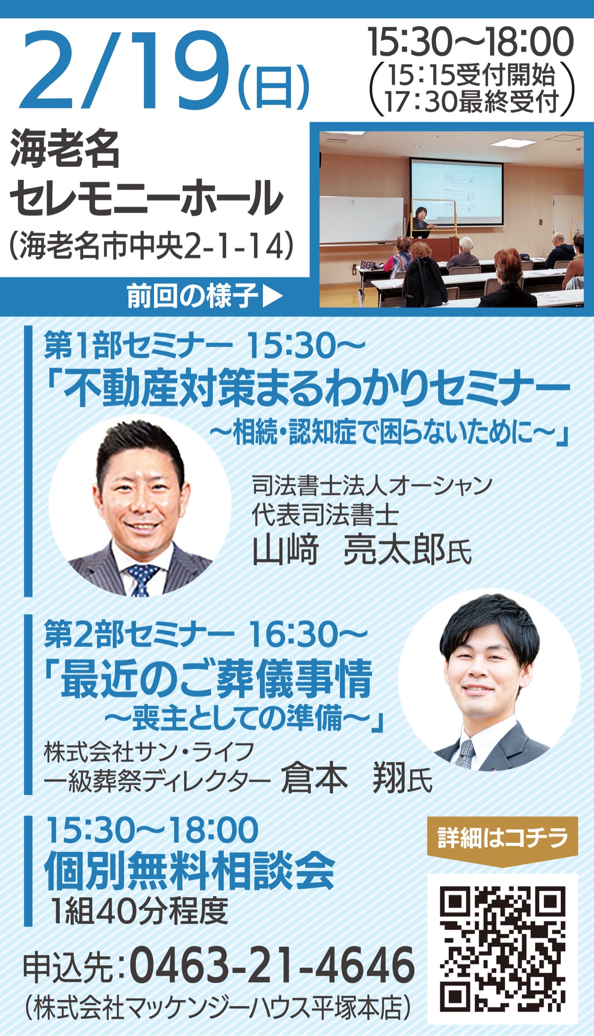 相続、終活、空き家などにまつわる問題に各分野の専門家が応えてくれるセミナーと相談会が、2月19日(日)に海老名セレモニーホールで開催される。15時30分〜18時。