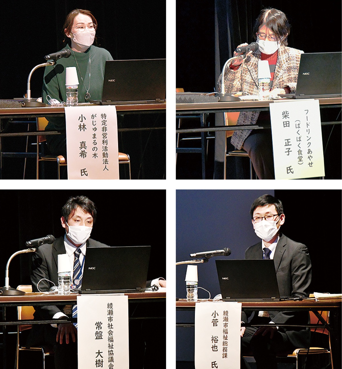 実践報告では、綾瀬市が官民連携で取り組む「フードリンクあやせ」に参加する、市民グループ「ぱくぱく食堂」の柴田正子さん=人物風土記と、「NPO法人がじゅまるの木」の小林真希さんのほか、法制度に基づき生活困窮者支援に取り組む綾瀬市役所と綾瀬市社会福祉協議会の担当職員が登壇し、取り組みや事業の実施状況などについて説明した。