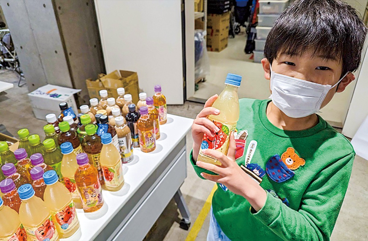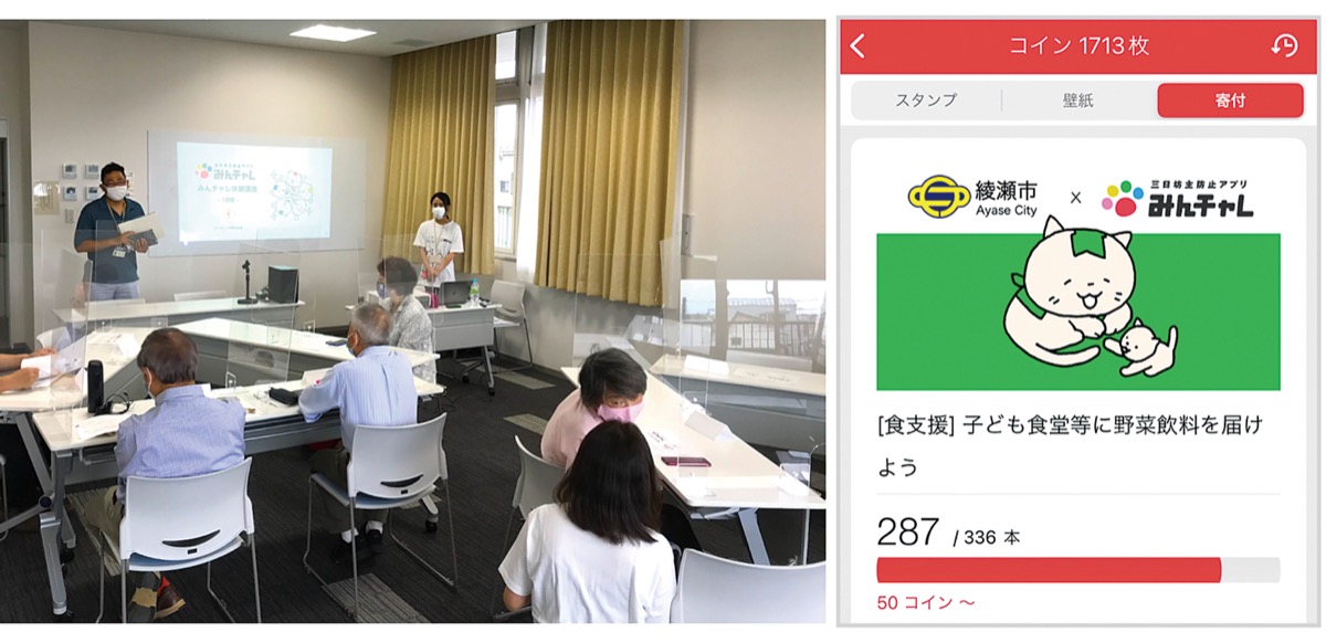 綾瀬市がフレイル予防事業として普及に取り組む習慣化アプリ「みんチャレ」。利用者が活動で貯めた「コイン」をもとに同市はこのほど、食料支援活動の「フードリンクあやせ」に、お茶やジュース500本を寄付した。
