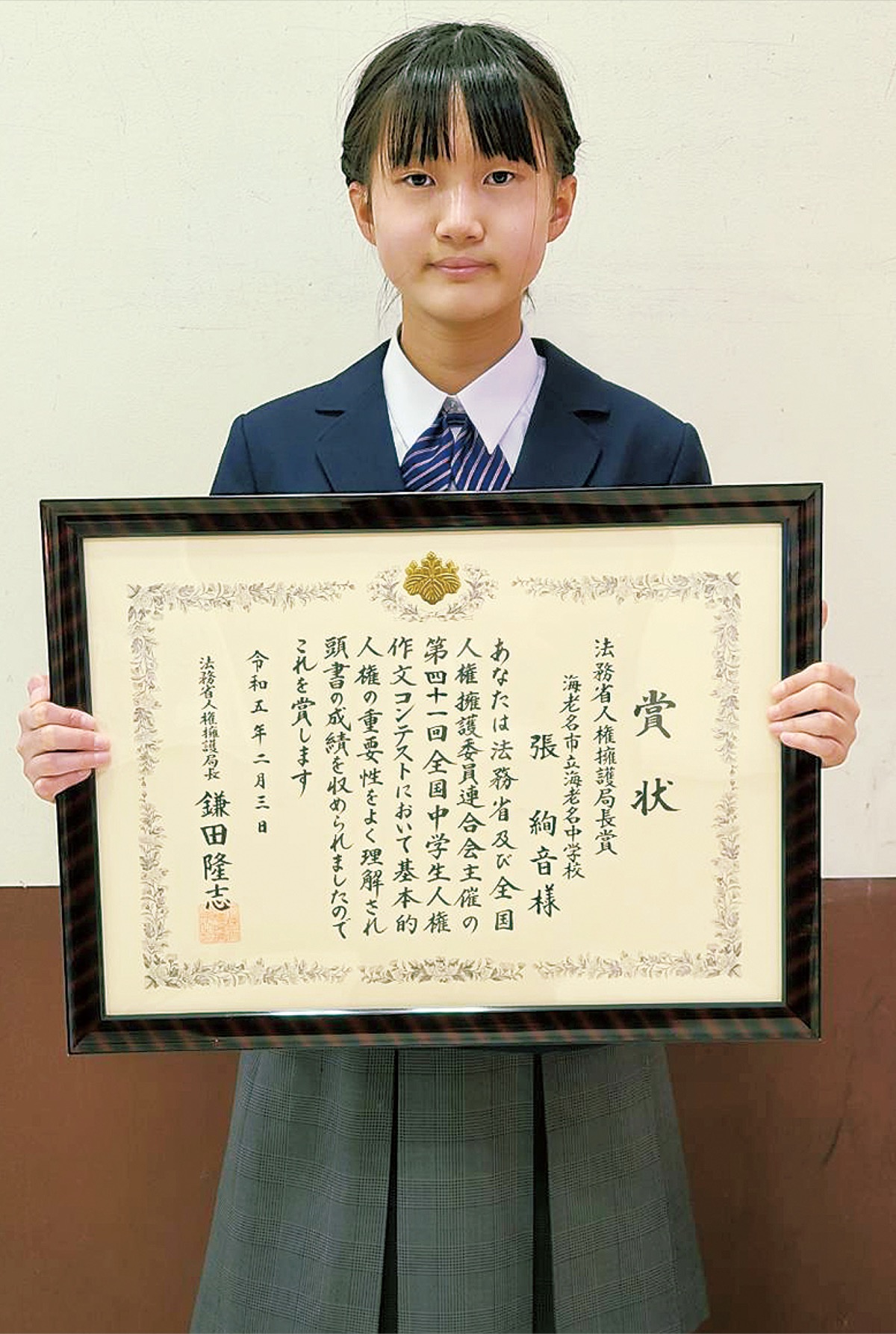 海老名市立海老名中学校3年の張絢音(ちょうあやね)さんが、法務省と全国人権擁護委員連合会主催の「第41回全国中学生人権作文コンテスト中央大会」で法務省人権擁護局長賞をこのほど受賞し、賞状を受け取った。
