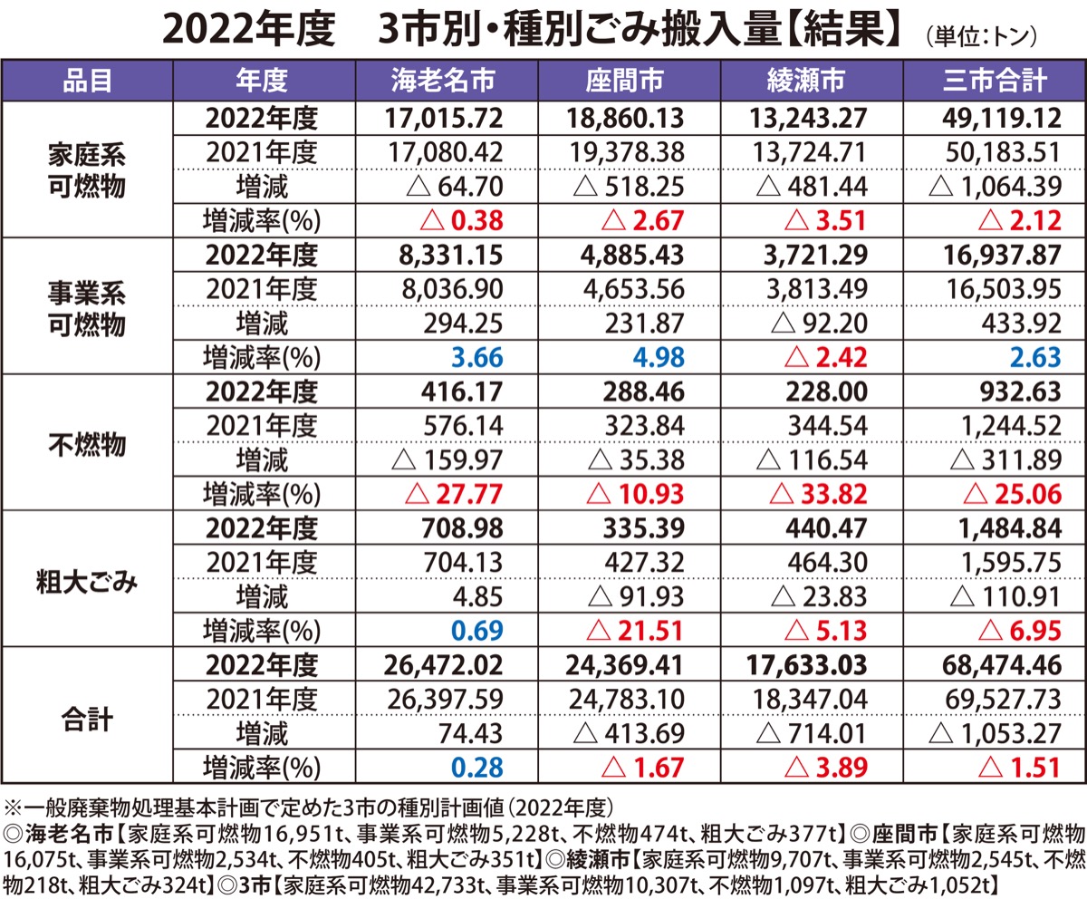 3市で構成する高座清掃施設組合がこのほどホームページで公表した2022年度の「構成市別・種別ごみ搬入量」によると、昨年4月から今年3月末までの1年間に3市から同センターへ搬入された家庭系の「可燃物」「不燃物」「粗大ごみ」の総量は5万1536トンで、前の年から約1・5トン減、3年連続で減少した。