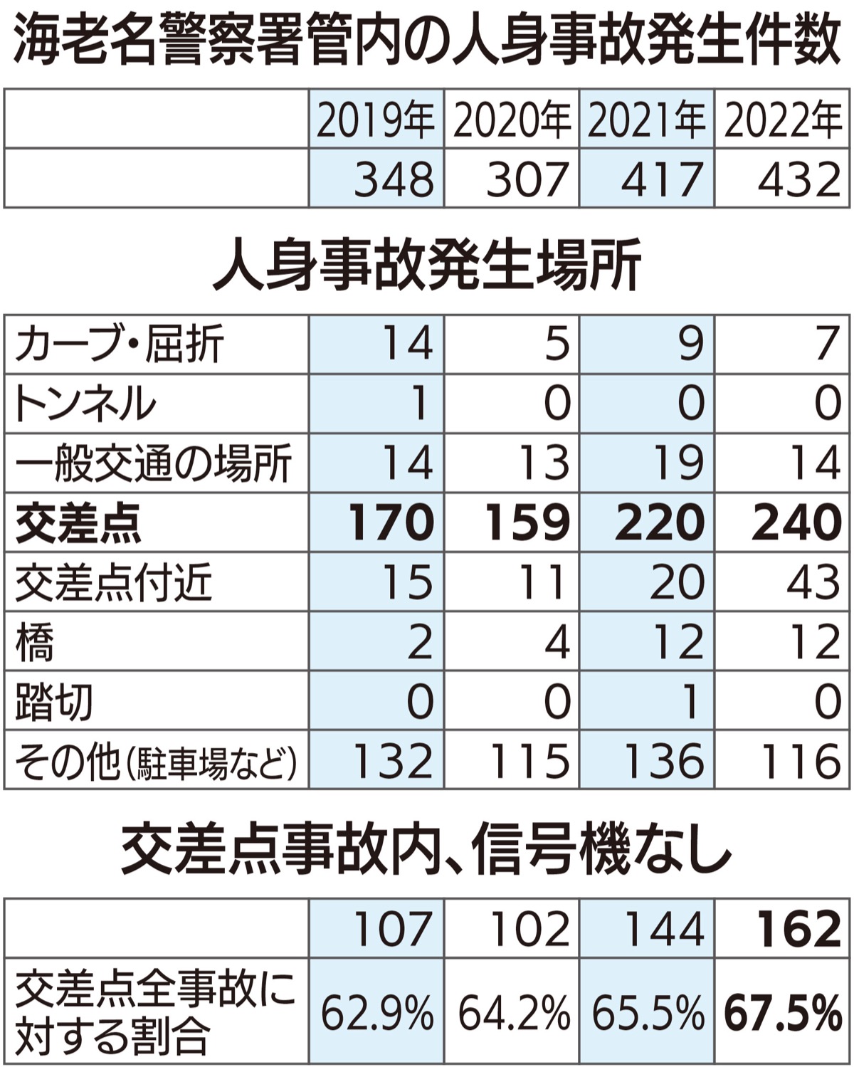 過去3年間の県内事故件数は、コロナ禍による外出自粛の影響でやや減少傾向にあるが、海老名署管内では2年連続で増加。同署交通課では、人口増加や大型商業施設への来店と物流拠点の開業に伴い、「交通量が増加したのも原因の一つ」と指摘する。